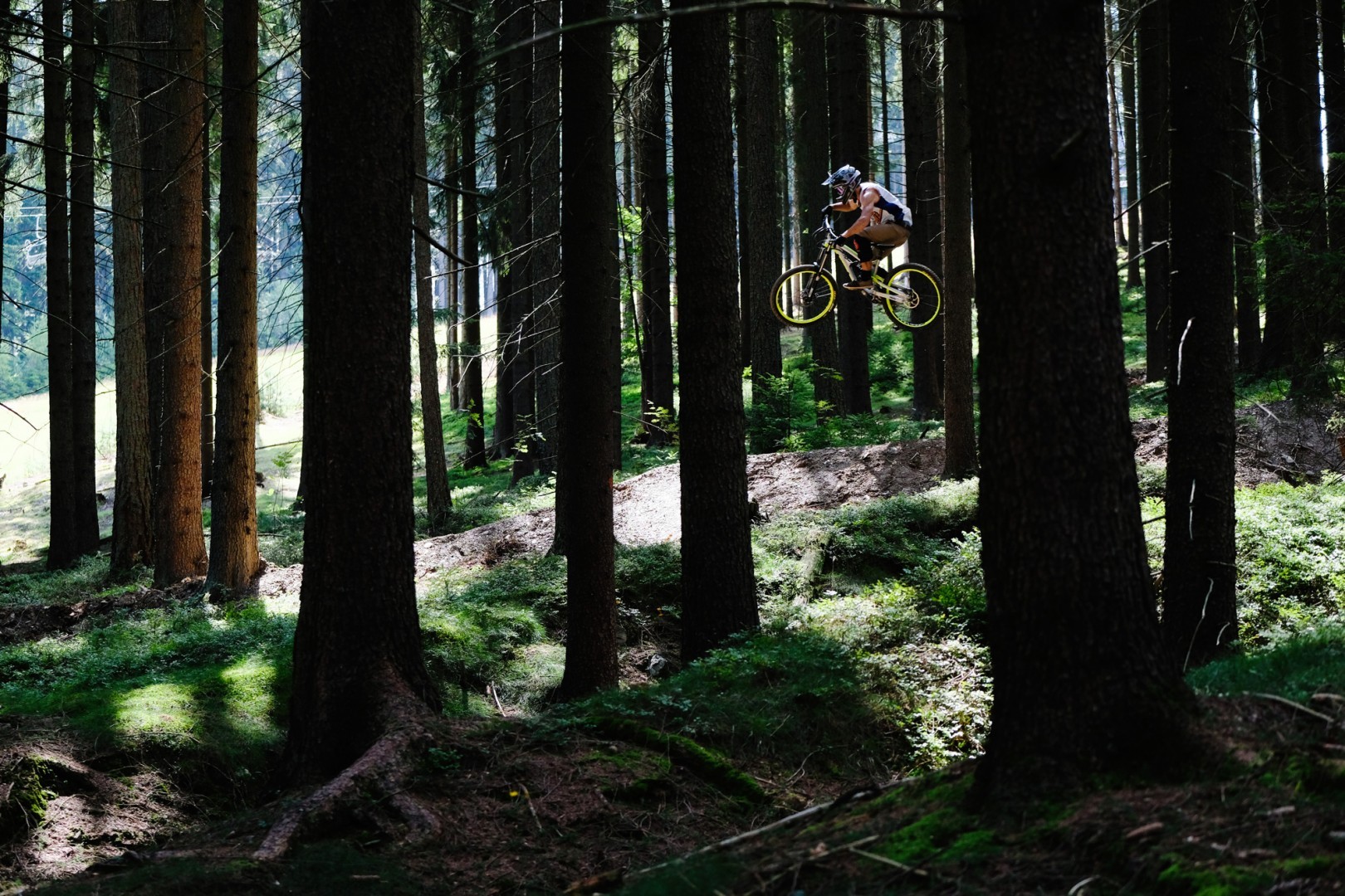 Unterhaltung in geneigten Kurven, Terrainwellen, Bänken, auf Steinfeldern und Holzstegen. Dies ist der neue Bikepark.