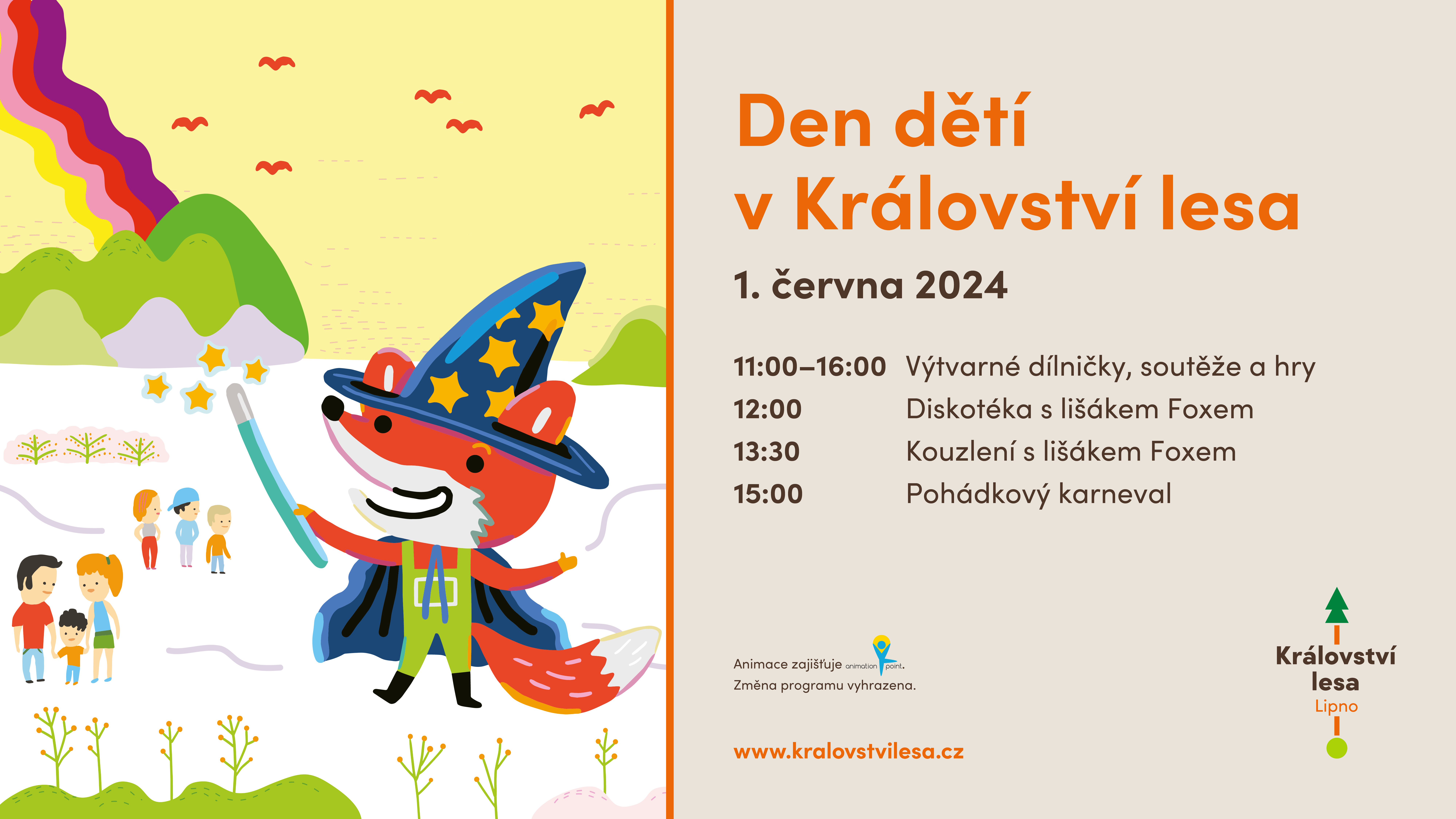 V sobotu prvního června budou naše děti slavit svátek. Myslíme na Vás a abyste rozzářili dětská očka Vašich ratolestí, připravili jsme na jejich svátek parádní den dětí v Království lesa na Lipně. Od jedenácti hodin dopoledne proběhnou animace s naším maskotem lišákem Foxem. Budou dílničky, soutěže, hry, pohádkový kvíz o ceny a nebude chybět kouzelnické představení. To vše do patnácti hodin. Tím to ale neskončí. Od patnácti hodin odpoledne pak nastoupí Rybníkáři a těšte se na pohádkový karneval. Vaše auto nechte buď na parkovišti P2 a dojděte za námi kus pešky, nebo ho nechte na P1 a využijte buď lanovku Lipno Express, nebo Stezkabus.