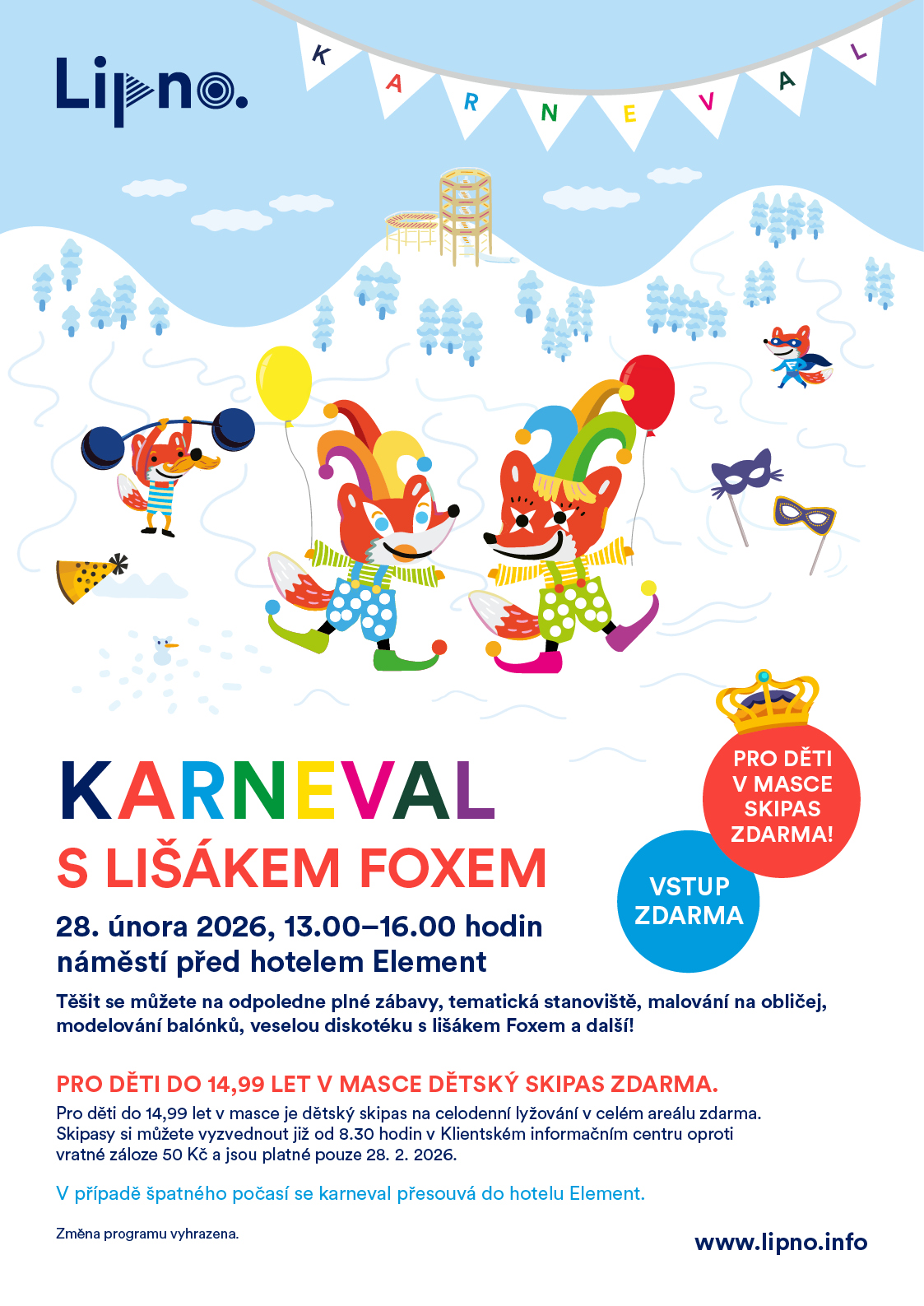 V sobotu 28. února od 13:00 do 16:00 ožije náměstíčko před hotelem Element pravou karnevalovou atmosférou! Přijeďte si zařádit s dětmi na svahu i mimo něj a užít si den plný barev, her a smíchu. Lišák Fox Vás provede zábavným odpolednem plným soutěžních stanovišť, kde se vyřádí malí i velcí. Čeká Vás skvělá nálada, hravé úkoly a společná radost, která rozzáří celý areál. Lišák Fox už se těší na Vaše masky!