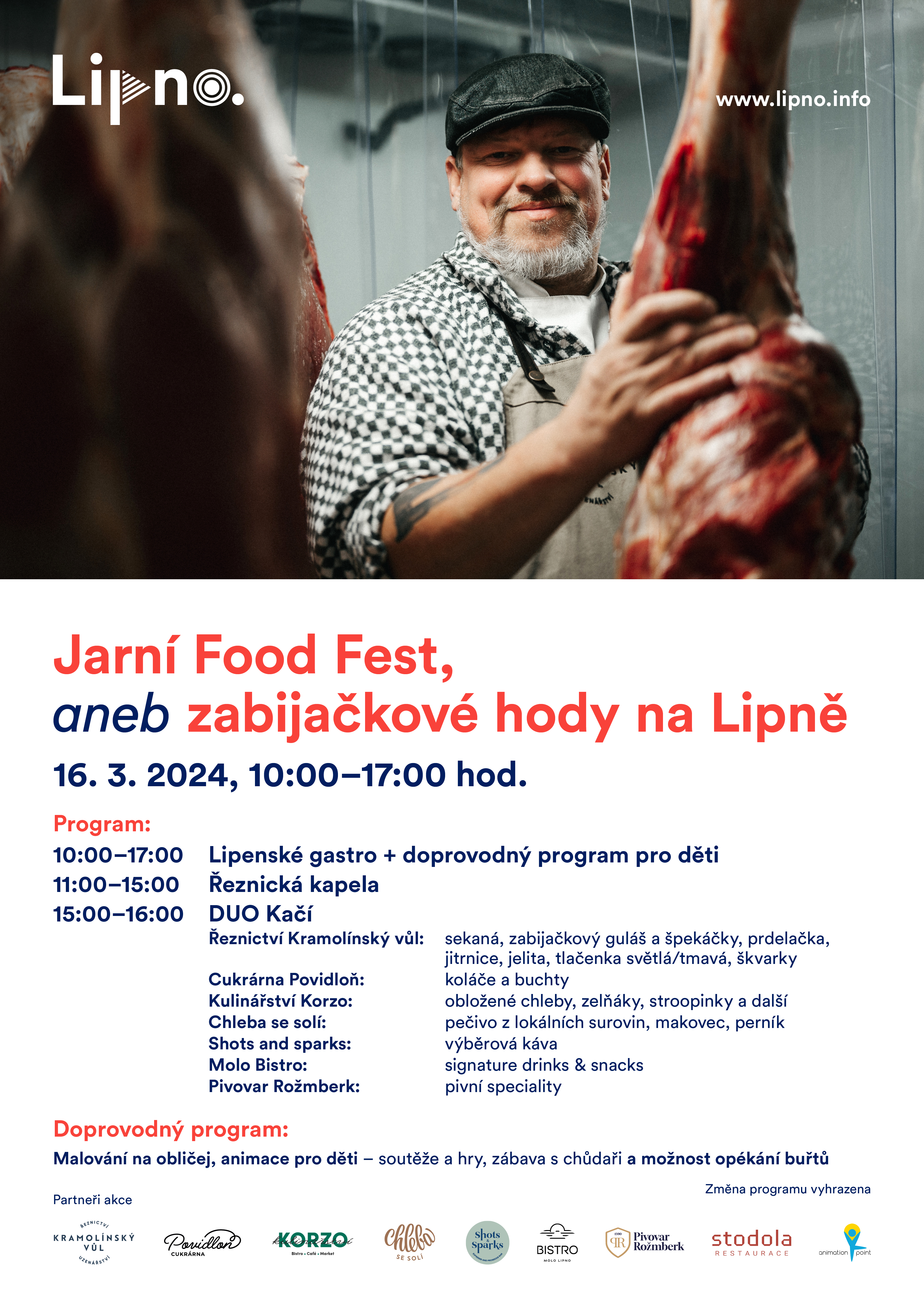 Jdeme do toho společně! Pozvali jsme ty nejlepší z lipenské gastro scény a nachystali historicky první Jarní Lipno Food Fest. Tradiční zabijačkové hody doplní řemeslné pečivo, lokální pivo, skvělá káva a na své si přijdou i milovníci míchaných drinků. Nebude chybět bohatý doprovodný program. Během dne vystoupí řeznická kapela, Duo Kačí, chůdaři, proběhne malování na obličej a na místě bude připravené opékání špekáčků. Startujeme už v 10:00 a program bude připravený po celý den.