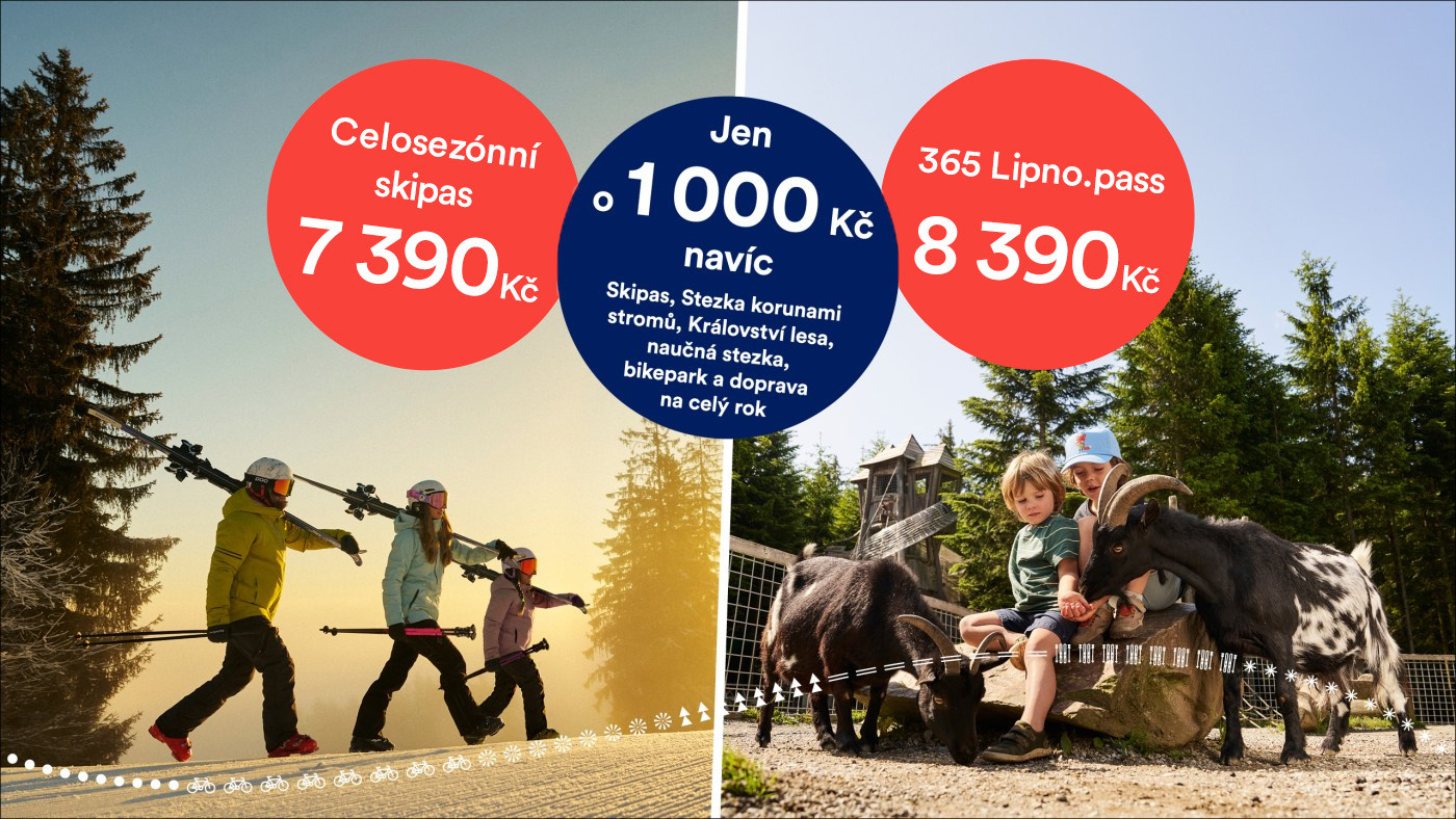 Myslete na zimní pohodu s předstihem – právě teď spouštíme prodej celosezónních skipasů na sezónu 2026/2027 za tu nej cenu. Až do 30. 6. pořídíte celosezónní skipas nejvýhodněji - dospělý 7 390 Kč, dítě 6 390 Kč, zlevněný 6 390 Kč, senior 70+ 2 990 Kč a jedno dítě k jednomu dospělákovi, nebo seniorovi jen za 500 Kč. Nákup moc brzo? Nebojte, i na příští zimu platí naše garance! Pokud se v sezóně nebude lyžovat alespoň 60 dní, vrátíme Vám peníze. Chcete z Lipna vytěžit maximum po celý rok? Přihoďte 1 000 Kč a máte 365.pass – kouzelnou permici, která kromě celosezónního skipasu přidá neomezený vstup na Stezku korunami stromů i do Království lesa, Bikepark a Singletrack, dopravu lanovkami a Stezkabusem a navíc i kolo zdarma ve vlaku na trase Rožmberk – Lipno nad Vltavou. Kupte teď, užívejte celý rok!