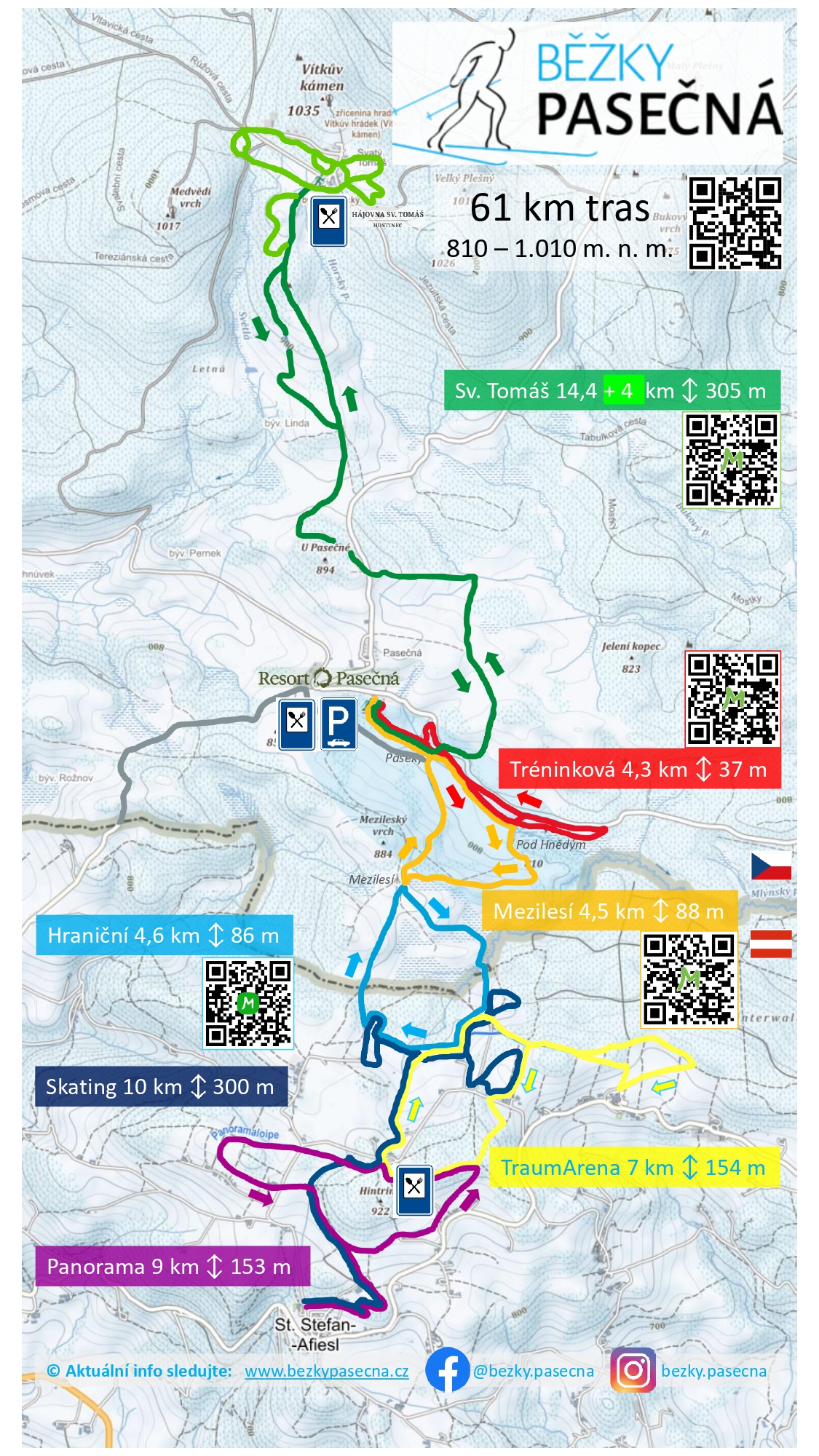 V areálu si přijdou na své jak začátečníci a rodiny s dětmi, tak skuteční fajnšmekři a ostřílení běžci. Najdete tu cvičnou louku, která disponuje dvěma stopami vedle sebe, a tak je naprosto ideální například pro učení dětí. Stejně tak vás ale čekají sportovní trasy různých náročností, třeba 11 km trasa s převýšením 264 m až na Svatého Tomáše, kde se můžete těšit na nejkrásnější výhled na rakouské Alpy z Vítkova hrádku. Nebo vyběhněte na další 11 km okruh směrem k rakouské hranici, kde se plynule napojíte na TraumArenu St. Stefan - Afiesl a dalších 25 km na rakouské straně. Nově na vás tak čeká téměř 50 km pravidelně udržovaných a propojených tras. Samozřejmostí je pravidelná úprava terénními stroji s příslušenstvím pro výrobu stopy pro bruslení i klasiku.
