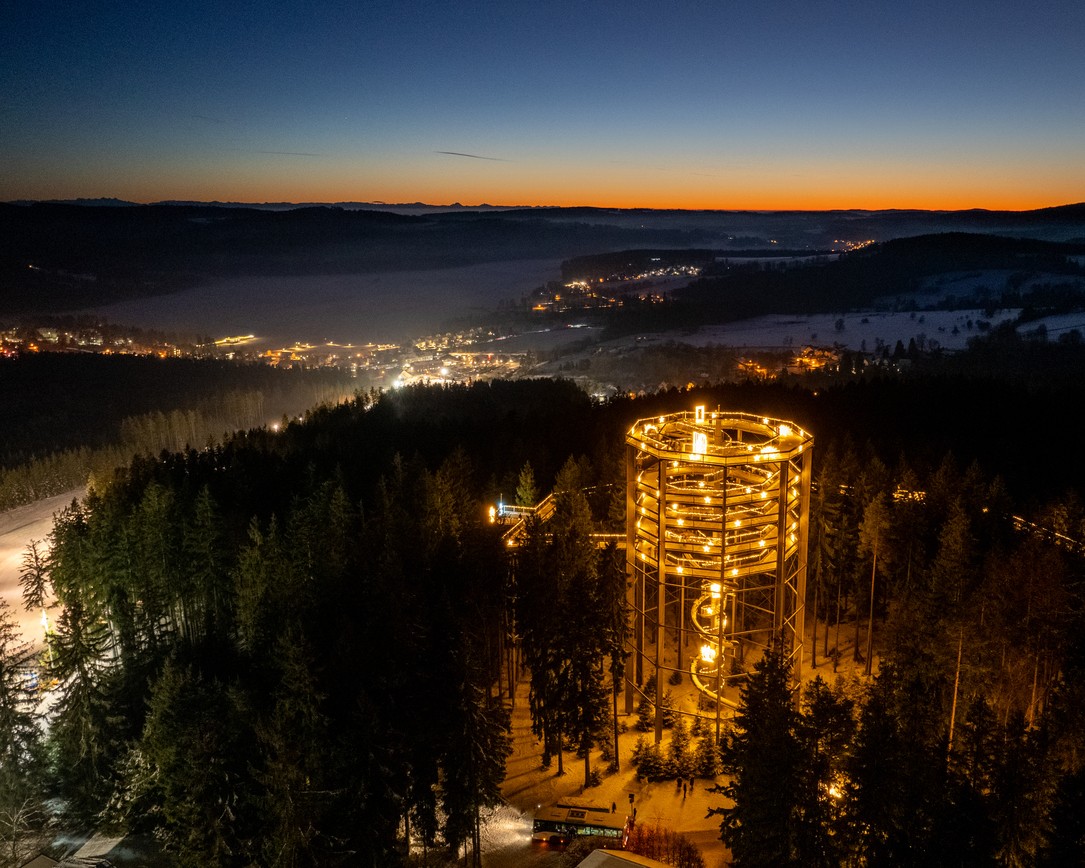 Od 28. listopadu se Stezka korunami stromů promění v kouzelný svět plný světel, barev a emocí. Každý večer od 17.00 do 20.00 (poslední vstup v 19.00) Vás čeká dechberoucí atmosféra večerního lesa – tisíce světýlek, zářící zvířata, pohádková zákoutí a světelná cesta k vrcholu Stezky. Tohle není obyčejná procházka, tohle je zážitek, na který nezapomenete. Stezkabus Vás pohodlně doveze na místo. Stezka korunami stromů Lipno, celorepublikový unikát a první stezka svého druhu v České republice, přivítala své první návštěvníky 10. července 2012. Stezka je citlivě začleněna do krajiny v okolí lipenského jezera a je unikátním doplněním Lipna. Uceluje tak nabídku sportovních, výchovných a zábavných aktivit.